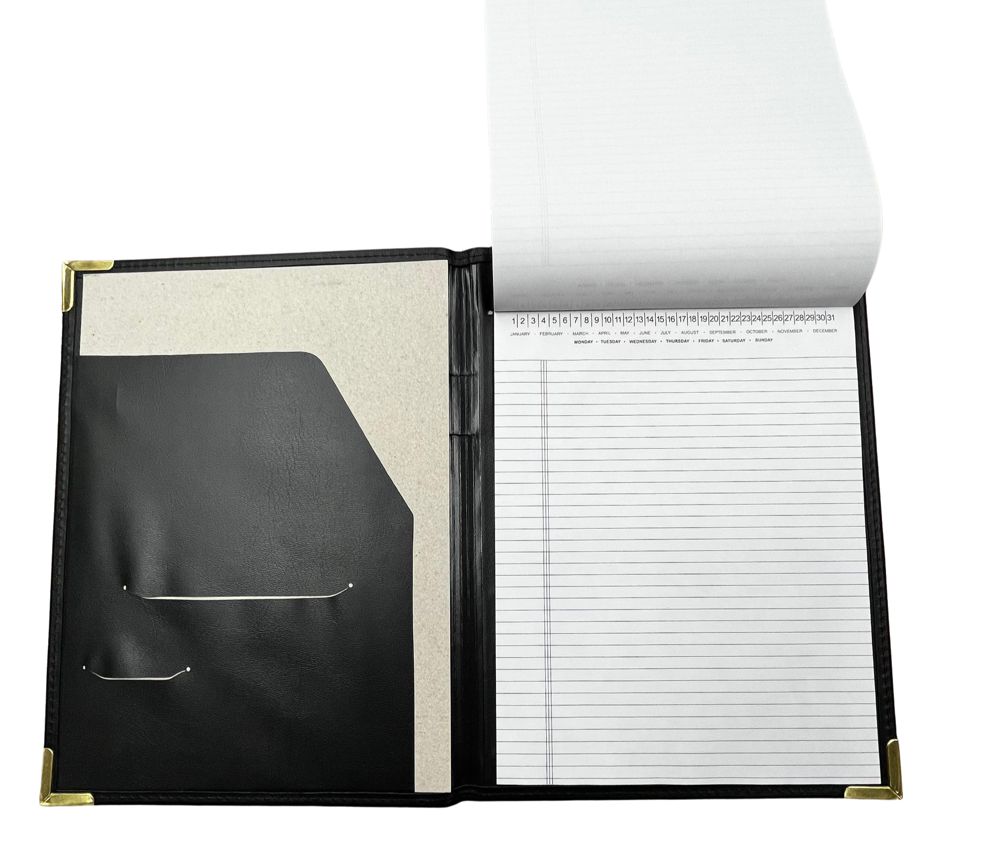Classic Padfolio - Foil Deboss Look professional at any meeting, conference, or sporting event with this ONU padfolio! Matte black padfolio with Olivet Nazarene University in gold. Gold metal corner protective edging. Inside features 1 pocket folder with one slit for notecards and one slit for business cards. On the other side, there is one legal notepad insert. A pen holder is available in the spine as well!